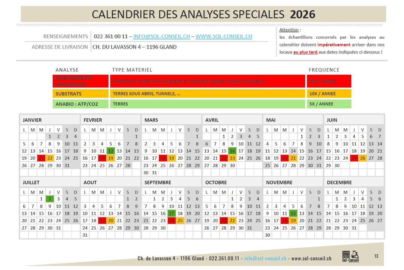 Les échantillons concernés par les analyses au calendrier doivent impérativement arriver dans nos locaux au plus tard aux dates indiquées ci-dessous !
